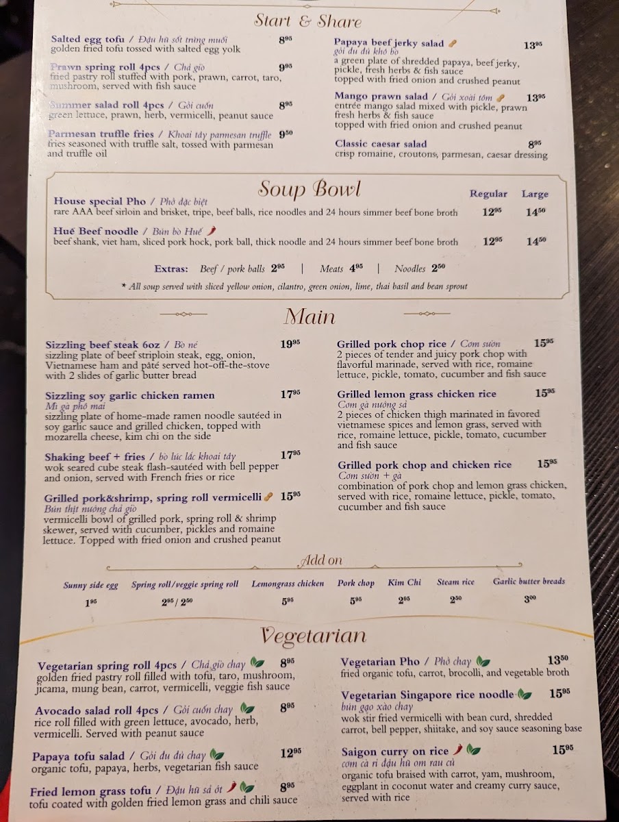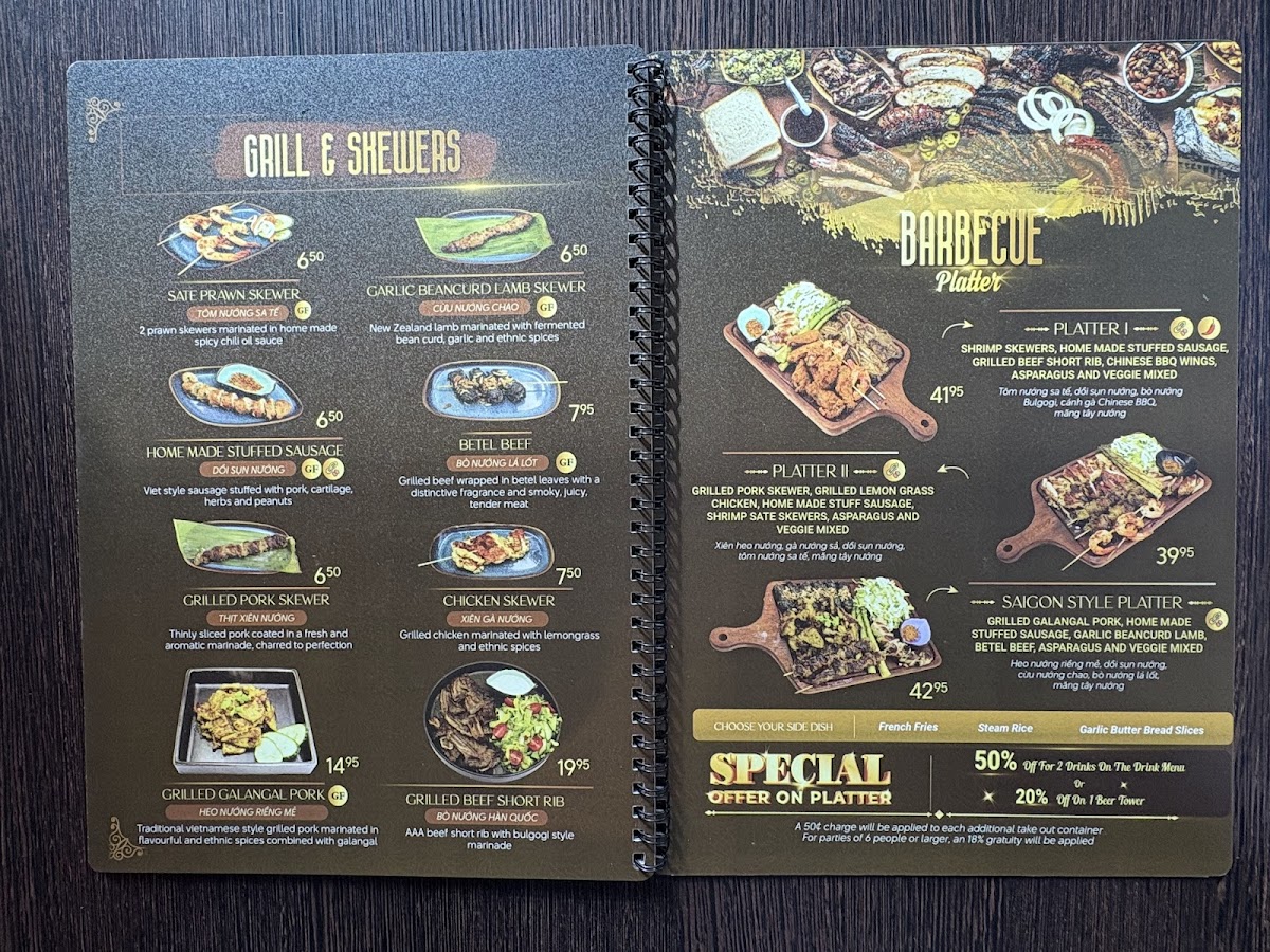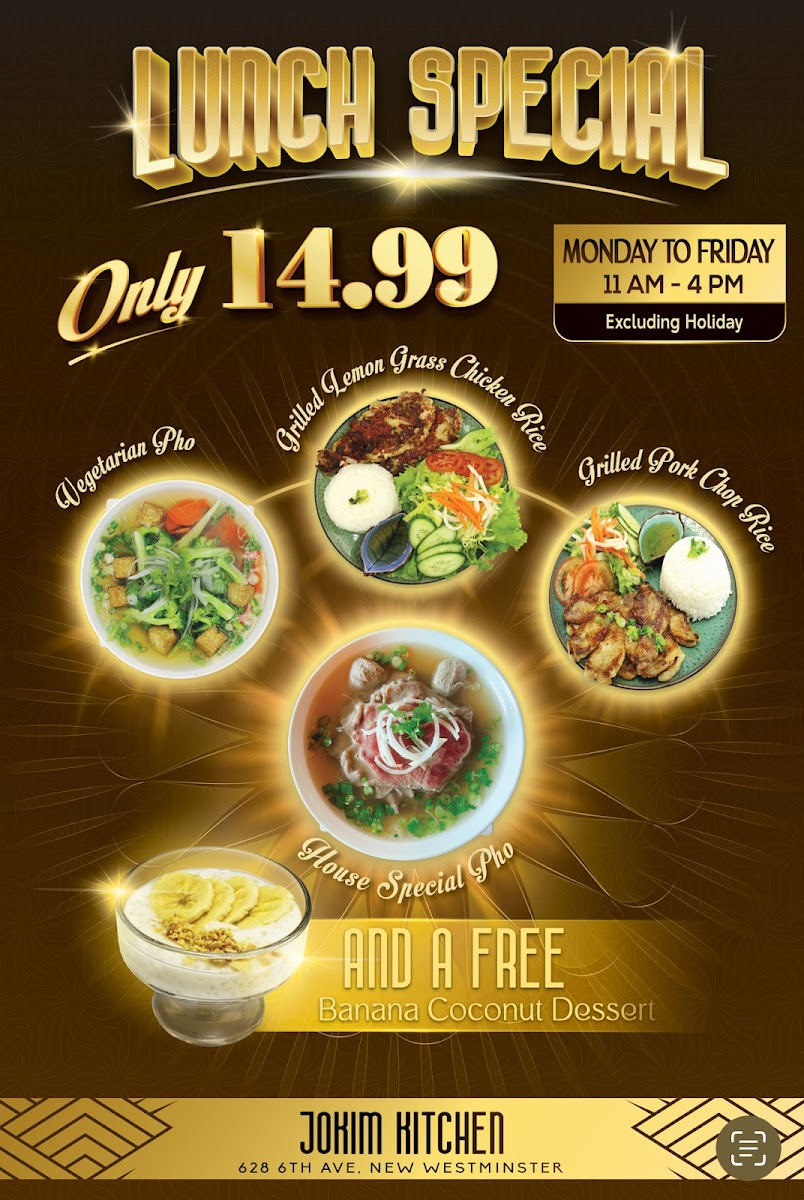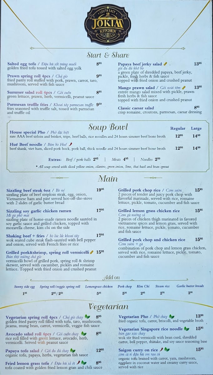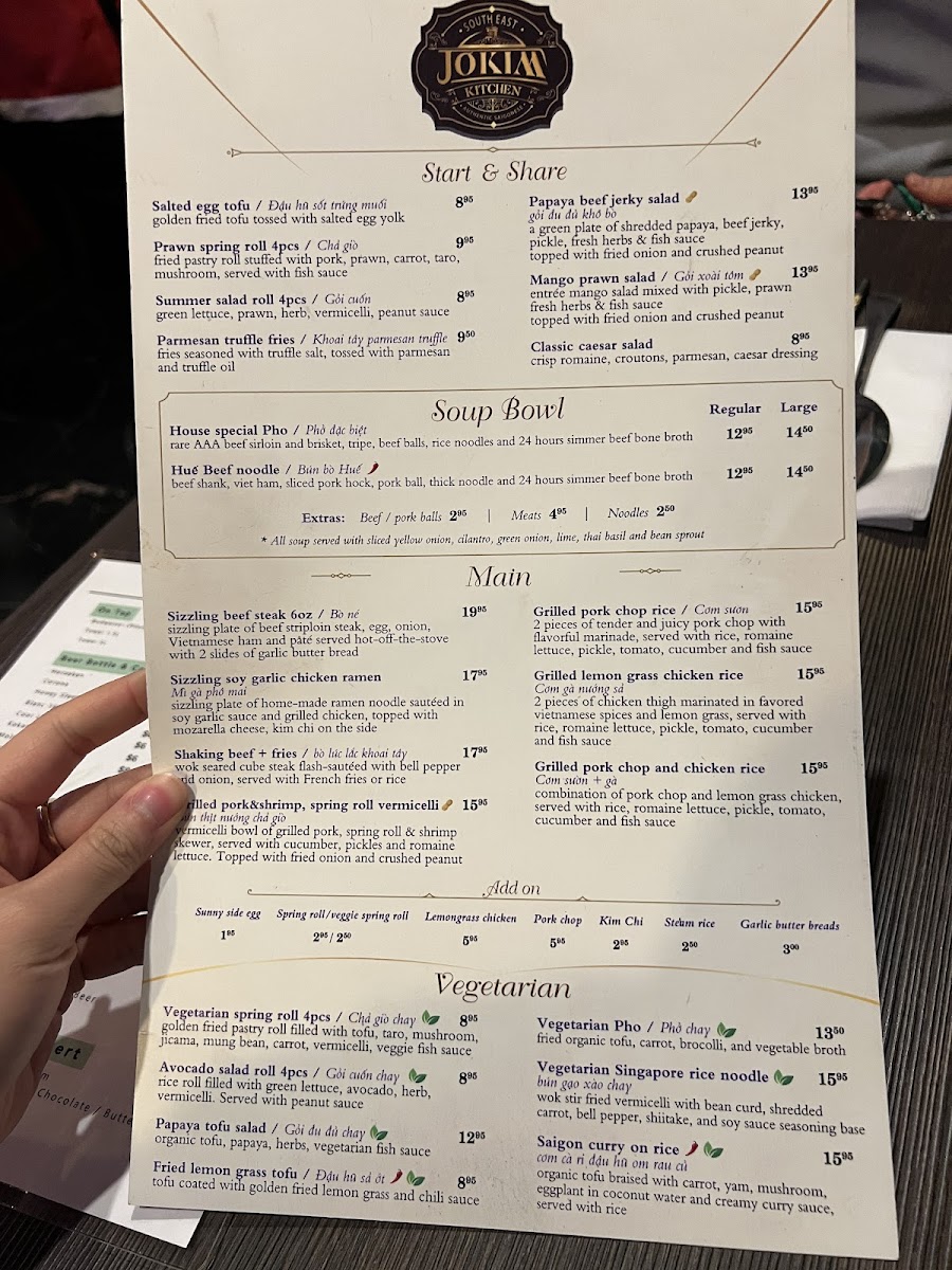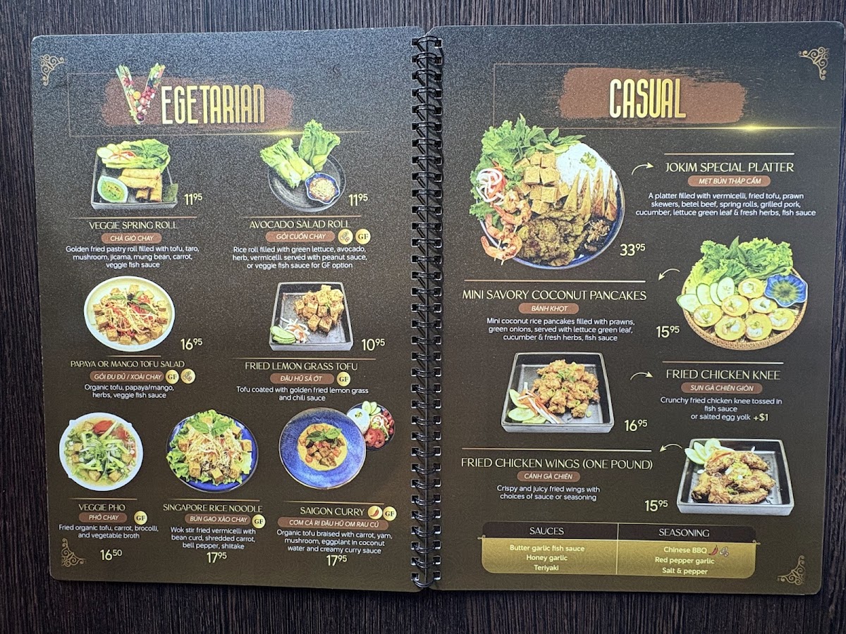 From a reviewer’s perspective, the menu at Jokim Kitchen offers a well-rounded selection of Vietnamese favorites and casual share plates, making it easy to sample a variety of flavors in one visit. The starters like Đậu Hũ Sốt Trứng Muối / Salted Egg Tofu, Chả Giò / Prawn Spring Roll 4 Pcs, Gỏi Cuốn / Summer Salad Roll 4 Pcs, Parmesan Truffle Fries, and Gỏi Đu Đủ Khô Bò / Papaya Beef Jerky Salad set a strong tone, while comforting bowls such as Phở Đặc Biệt / House Special Pho and Bún Bò Huế / Huế Beef Noodle highlight the restaurant’s traditional roots. Heartier mains including Mì Gà Phô Mai / Sizzling Soy Garlic Chicken Ramen, Bò Lúc Lắc Khoai Tây / Shaking Beef & Fries, Bún Thịt Nướng Chả Giò / Grilled Pork & Shrimp, Spring Roll Vermicelli, Cơm Sườn / Grilled Pork Chop Rice, and Cơm Gà Nướng Sả / Grilled Lemongrass Chicken Rice provide satisfying options, while vegetarian dishes like Chả Giò Chay / Vegetarian Spring Roll 4 Pcs, Gỏi Cuốn Chay / Avocado Salad Roll 4 Pcs, Gỏi Đu Đủ Chay / Vegetarian Papaya Salad, Đậu Hũ Sả Ớt / Fried Lemongrass Tofu, and Phở Chay / Vegetarian Pho ensure there’s something for everyone. For more casual bites, items such as Mẹt Bún Thập Cẩm / Special Platter, Bánh Khọt / Mini Savoury Coconut Pancakes, Sụn Gà Chiên Giòn / Fried Chicken Knee, and Cánh Gà Chiên / Fried Chicken Wings (One Pound) are great for sharing, while the grill section with Heo Nướng Riềng Mẻ / Grilled Galangal Pork, Bò Nướng Hàn Quốc / Grilled Bulgogi Beef Short Rib, Tôm Nướng Sa Tế / Sate Prawn Skewer, Cùu Nướng Chao / Garlic Beancurd Lamb Skewer, and Dồi Sụn Nướng / Homemade Stuffed Sausage rounds out the menu with bold, smoky flavors, leaving a strong overall impression of variety and value.